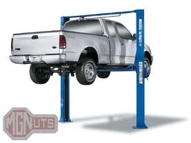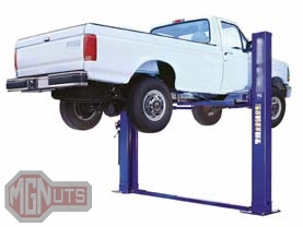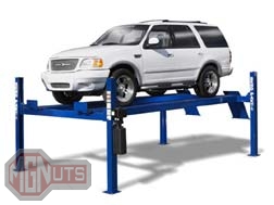 Maintenance: These lifts are by far the best for maintenance, offering unlimited access to the entire underbody. Placing the vehicle on the lift is not difficult but does require getting on your hands and knees and placing the “feet” on the vehicle’s chassis or frame. The overall height that you can lift your vehicle will be limited by the brace (if fitted) which spans the two columns at the top of the lift. So the larger the vehicle, the taller the lift you will need. Some two post lifts can be mounted without this support.