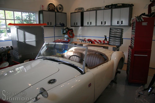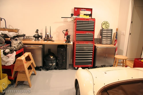 Even during construction, maintenance must continue! The MGA is getting a rear brake inspection and a few other minor maintenance-related tasks performed. Despite the relative mess and difficulty finding my tools and supplies, this is already MUCH better than working in the old garage!