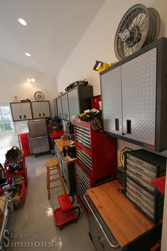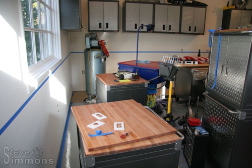 The wall cabinets are installed and bolted directly into wall studs for strength. Above them is the first load of decorations that will eventually grace the walls and cabinet tops. Cabinet height is set so that the first two shelves can be reached without a step stool. I didn’t want them any lower because it would crowd the work space over the workbench, solvent tank, etc.