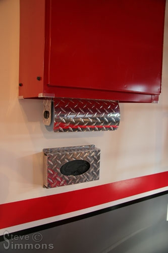 The decorative painting is finally completed after three days. I am quite pleased with the results! This photo also shows a couple diamond plate accessories installed. Still to follow will be diamond plate floor molding and artwork for the walls.