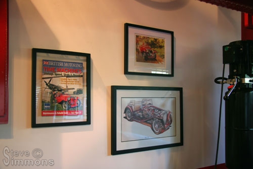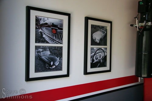Beside the MG TC are a reprint of the factory blueprints (large frame), some TC artwork and a magazine the car was in. We took far too long in the art store deciding what style frames to use. The blueprints required a custom frame and unfortunately it wasn’t cheap.