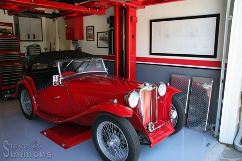 An additional piece of MG TC artwork is hung with the magazine and cutaway drawing. It’s easy to get carried away and clutter up the walls, so I called it quits here until I could get used to what was there. Ultimately I decided that this was enough, and that no artwork would be hung above the level of the bottom of the lifts while raised.