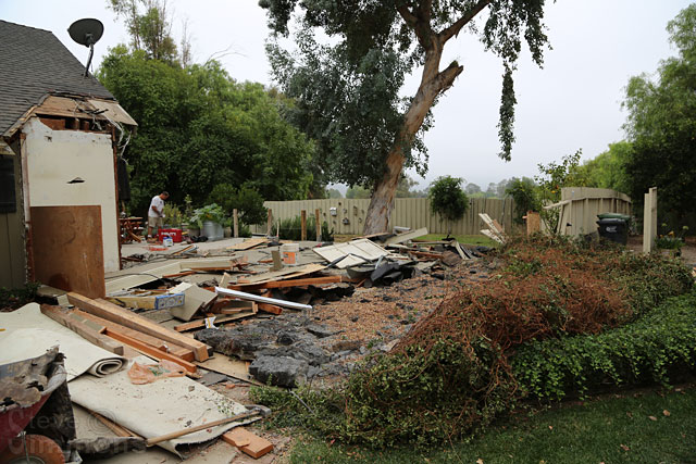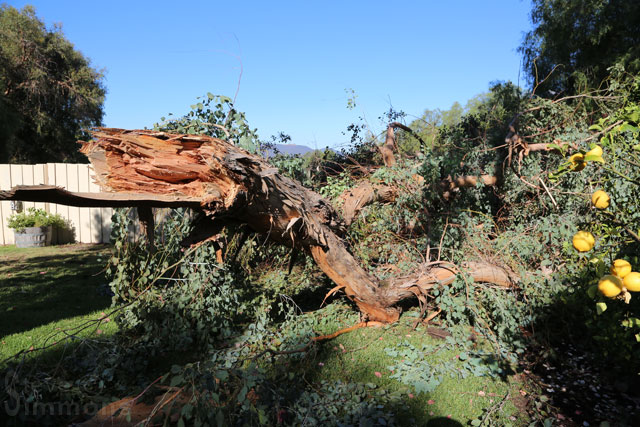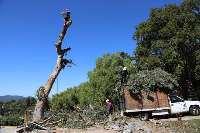 You’re looking at one third of a very large tree. Shortly before work began, this massive 50-foot-long section of the tree broke and fell into our yard, crushing three fences. Maybe the tree knew it was doomed, or perhaps this was a warning to stay away or it would kill anyone who came near it with a chainsaw. Regardless of whatever that tree was thinking, this reinforced our decision to have it removed. I just wish it had fallen the other way and crushed the garage. That would have saved us a lot of work!