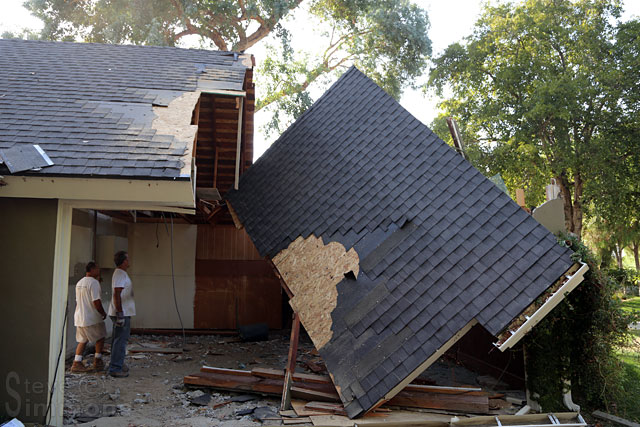 We immediately reach the point of no return as the first hole appears in the roof. The remaining two thirds of the killer tree looms in the background.