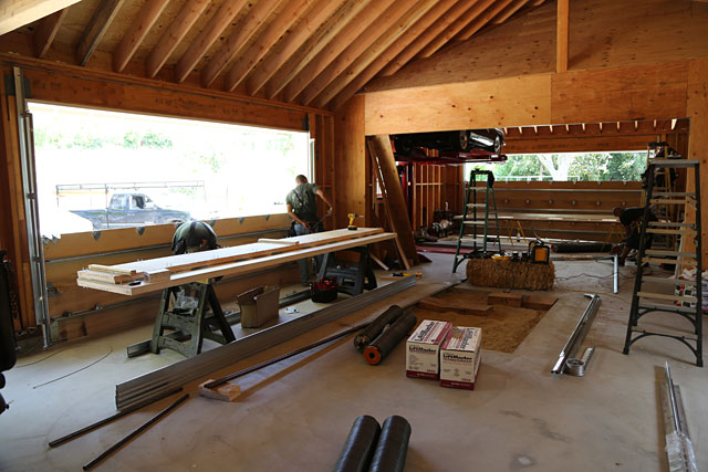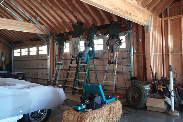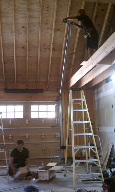 As in our previous garage, the door tracks are set up to follow the roof line in order to clear the lifts. But this garage is even taller than the last one, so extra tall ladders are required. In this case, the still incomplete storage loft is put to its first use.