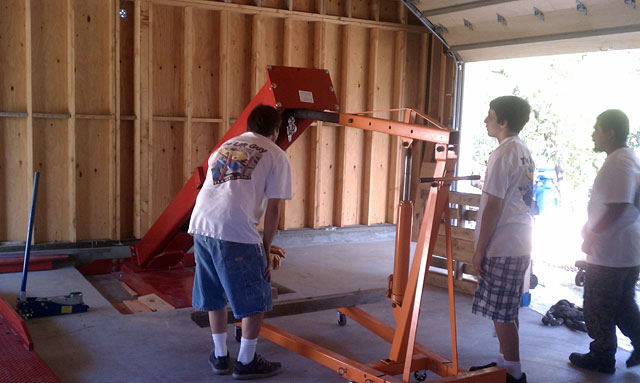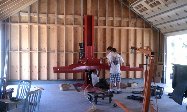 The only thing keeping the garage from being anything but a glorified carport was a lack of doors. It took a while to get them installed but finally we would have a sealed, secure structure. I know my amazingly patient wife was at least as anxious as I was, because there was still a large tool box in our living room! It was also time to do something about the remaining cars in the driveway, so the lifts were brought out of storage and readied for re-assembly. This was the point where we felt like the project might actually have an end in sight. It was still beyond the horizon, but it was there!