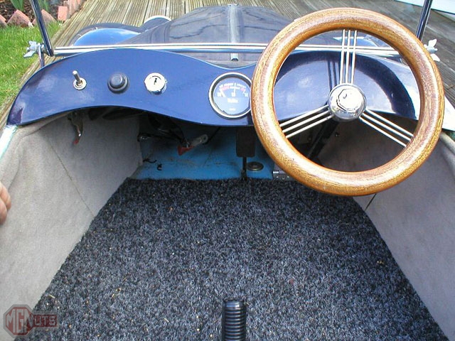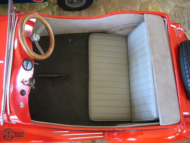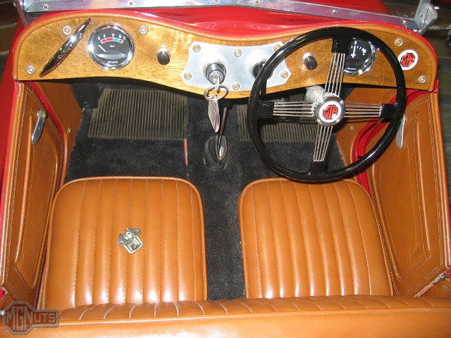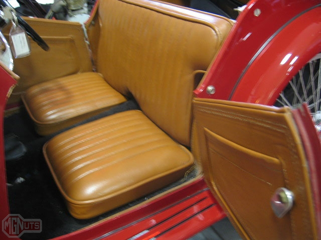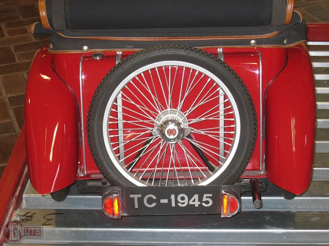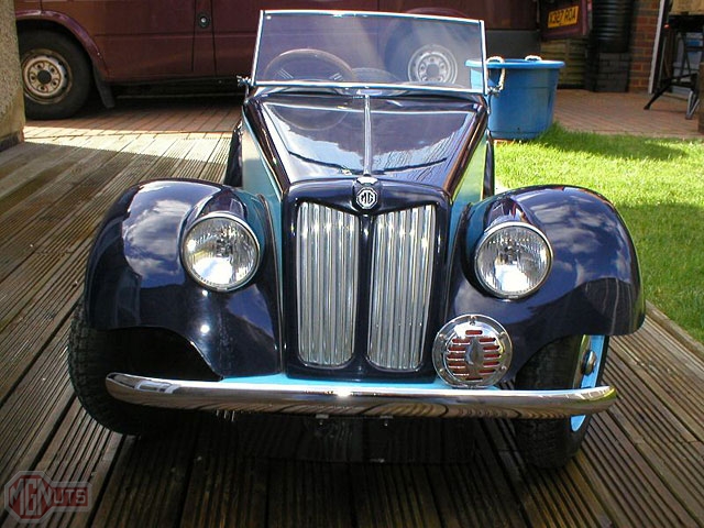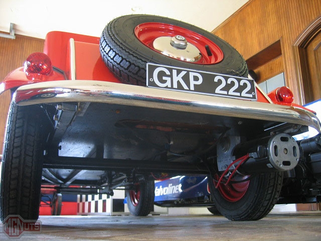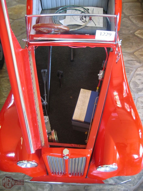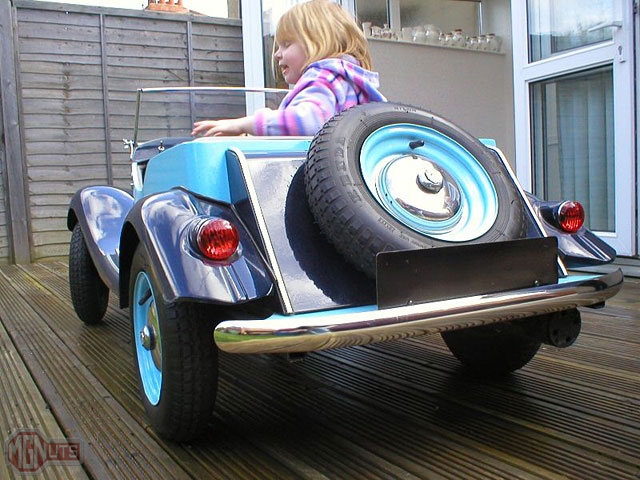 Battery-powered miniature MG TF, manufactured in England by Sunny Day Cars. It features a fiberglass body and battery power, with a working horn and lights, a wood steering wheel and spare tire.