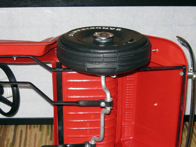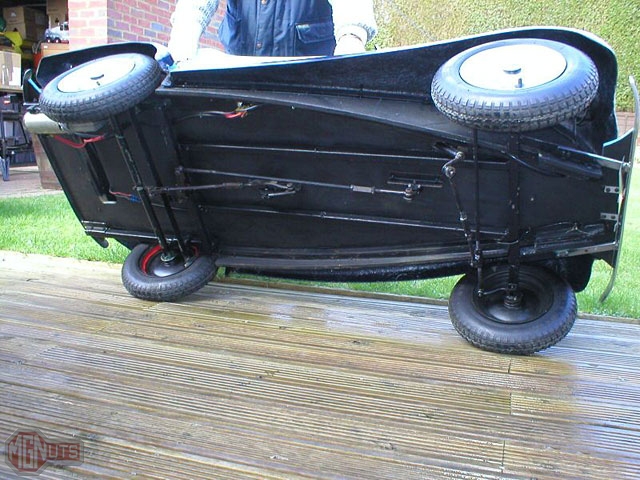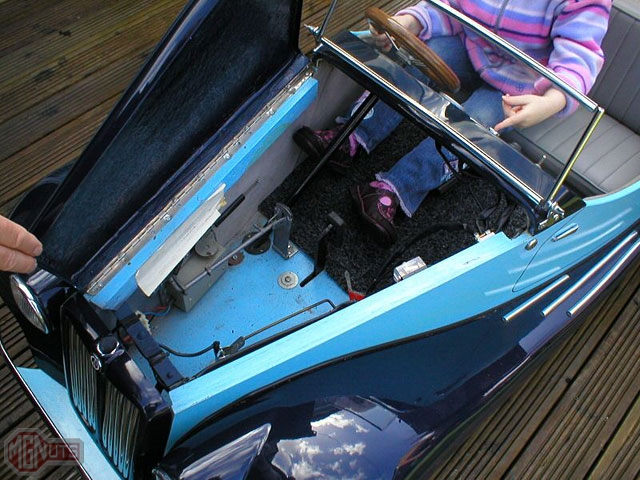 This pedal car was manufactured by Little Pedalers in England. It features leather hood straps, pneumatic tires and rear-mounted spare, working headlights, windscreen and side mirror. It comes with a registration book and a period licensing badge.
